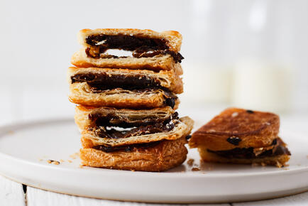[Honey Croissant] Minced apple, pecan, and honey-stuffed puff pastries served hot in a stack with chilled goat cheese spread.