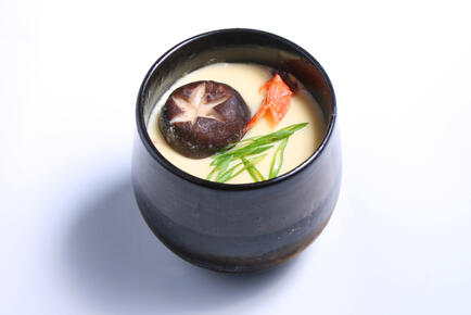 [Chawan-mushi] A savory steamed pudding featuring beaten egg infused with meats, greens and fish broth. Topped with saffron for a kick.