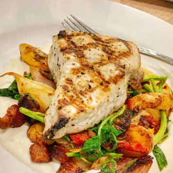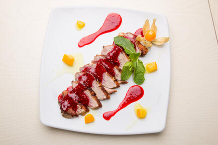 [Elpis Deipnon] Duck in a spiced wine sauce served atop seared endives.