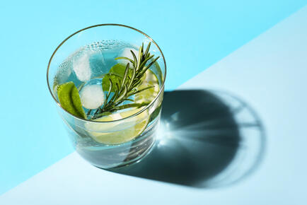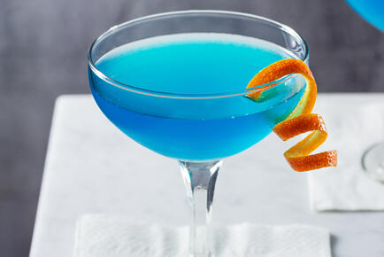 [Chamomile Tea] Gin, Chartreuse, lime juice, and Blue Curaçao swirl into the depths, where a kick of cinnamon, cayenne, and fresh ginger awaits. Garnished with a rosemary "tail."
