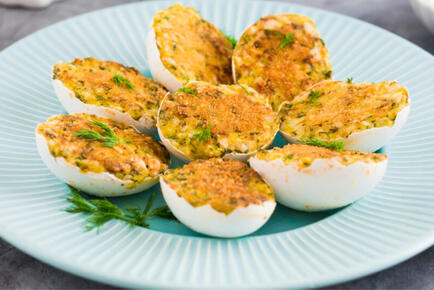[Royal Eggs] Boiled eggs mashed with butter, sautéed mushrooms, crispy bacon, and herbs, stuffed gently into their shells, then topped with breadcrumbs and pan fried.